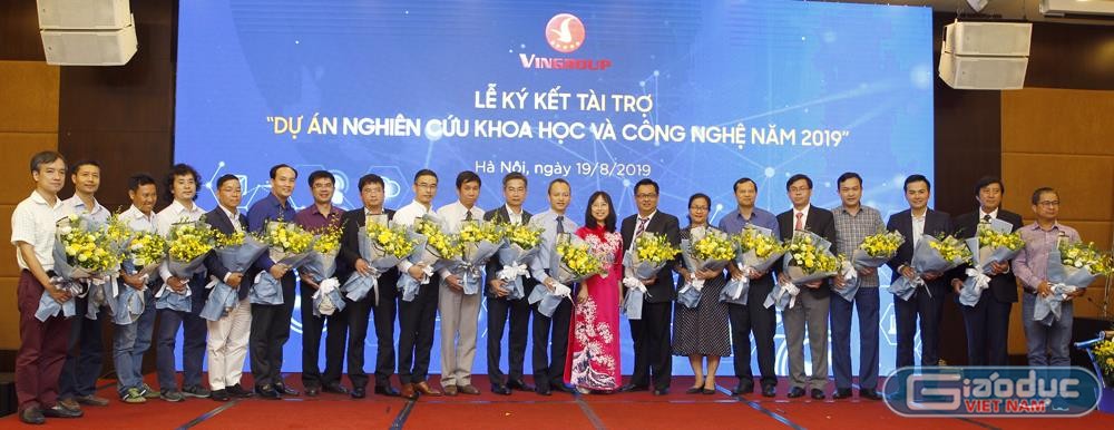 | Chủ nhiệm và thành viên của 20 dự án trong buổi lễ ký kết nhận tài trợ 124 tỷ đồng của Tập đoàn Vingroup. Ảnh: Tùng Dương. |