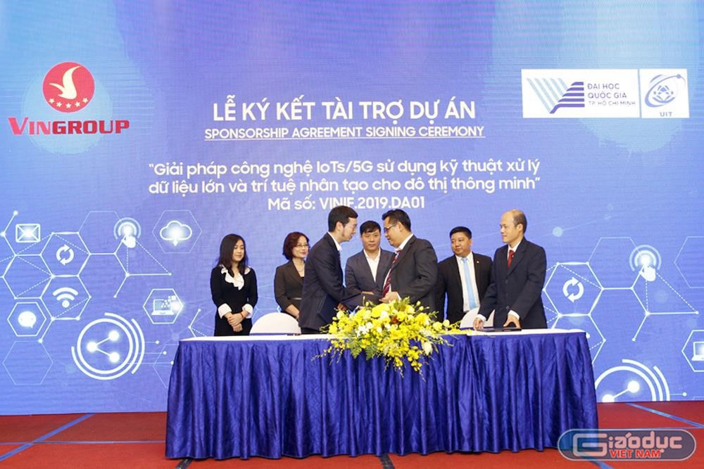 | Lễ ký kết tài trợ giữa Tập đoàn Vingroup với đại diện dự án Trường Đại học Công nghệ Thông tin - Đại học Quốc gia Thành phố Hồ Chí Minh. Ảnh: Tùng Dương. |